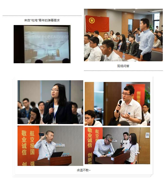 講座采用了多種信息化手段,實(shí)時(shí)的彈幕提問(wèn)與持續(xù)不斷的現(xiàn)場(chǎng)問(wèn)答將整個(gè)講座推向了高潮,“機(jī)庫(kù)吃雞”“BIM與區(qū)塊鏈”等互聯(lián)網(wǎng)熱點(diǎn)也成為青年員工關(guān)注的焦點(diǎn),即便散場(chǎng)以后,大家的熱情依舊不減,圍繞在云朋身邊的“問(wèn)題”青年不斷。